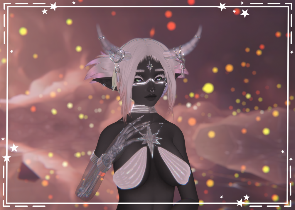 Top, sleeve, panties - bikini - hanging moon crystal - sword - index gestures (edited) - horns (edited) - tail - nose chain, ring accessories, chain veil - face textures (edited together) - skeleton - hair - body textures - body (fit), head (Savi) - piercings - female part, skirt (rigged by Cakie.exe) - pants - GoGoLoco - foot chain (comm'd to match facial jewellery by Xveriana) - tears - star particles - glyph particle